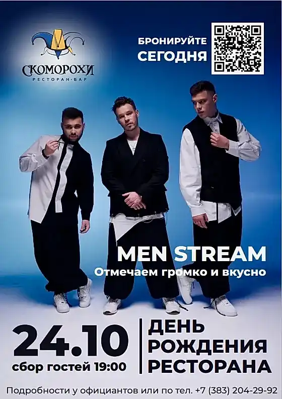 24 октября в ресторане Pin-Up вас ждёт праздничная программа, ведущий, подарки и зажигательное выступление группы Men Stream - Пати Ракеты!
