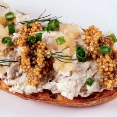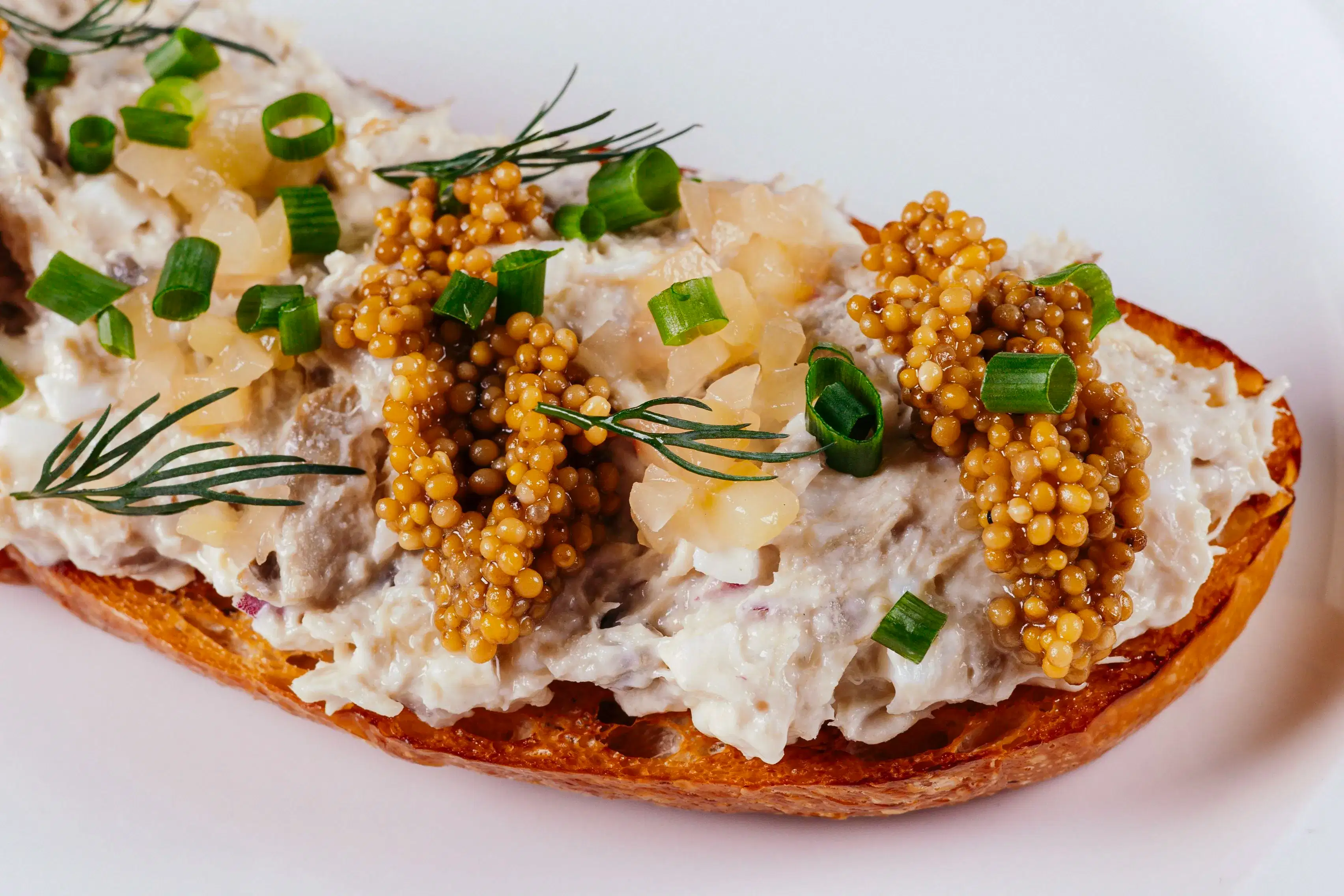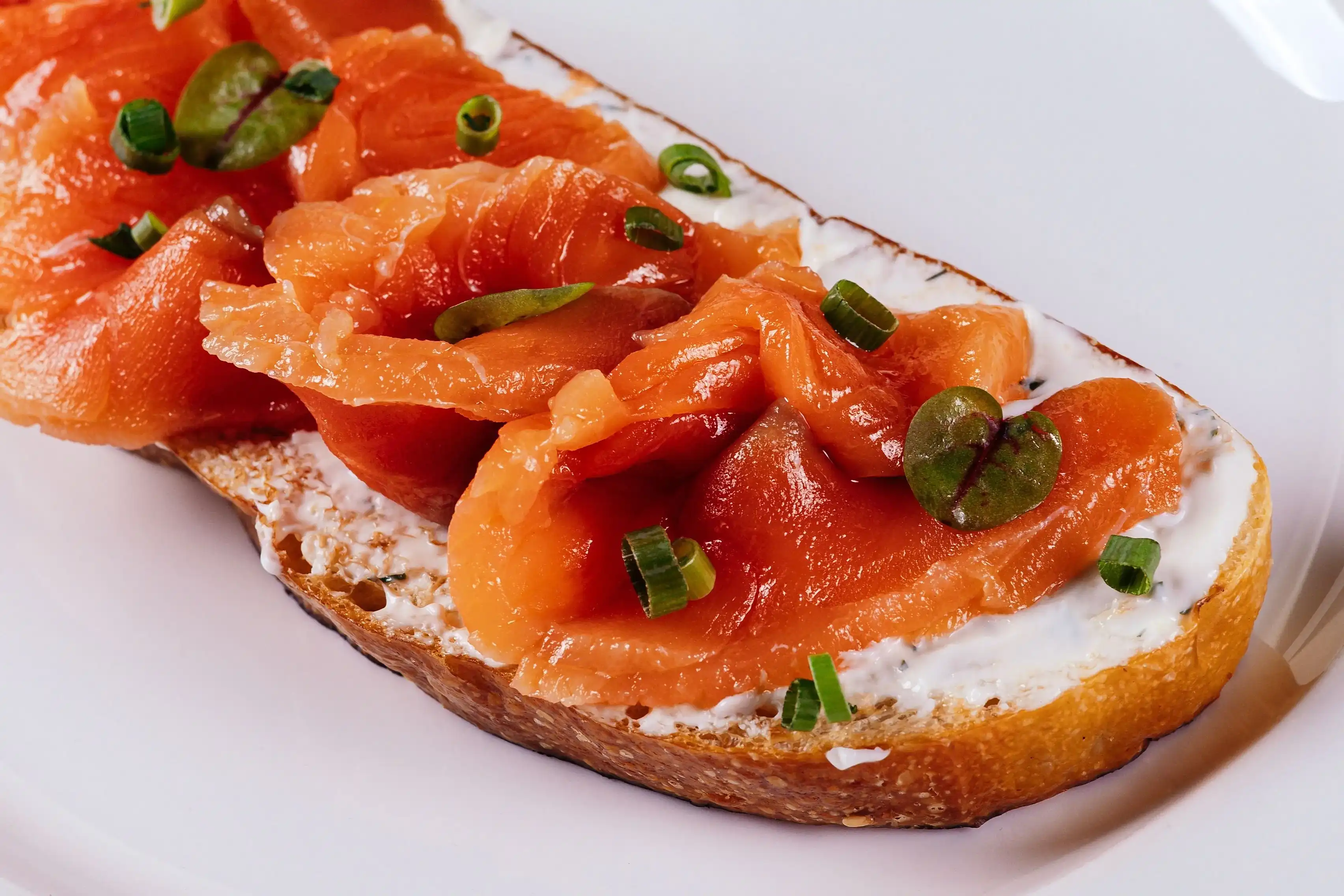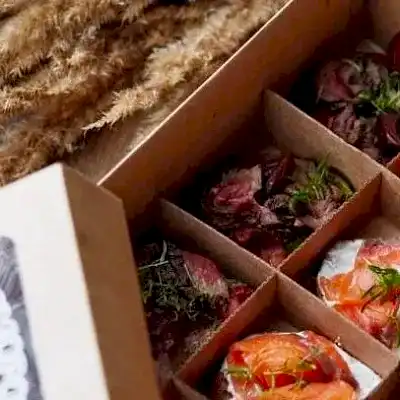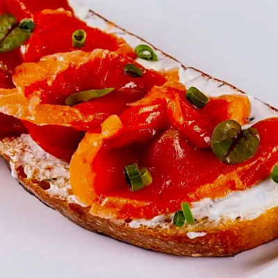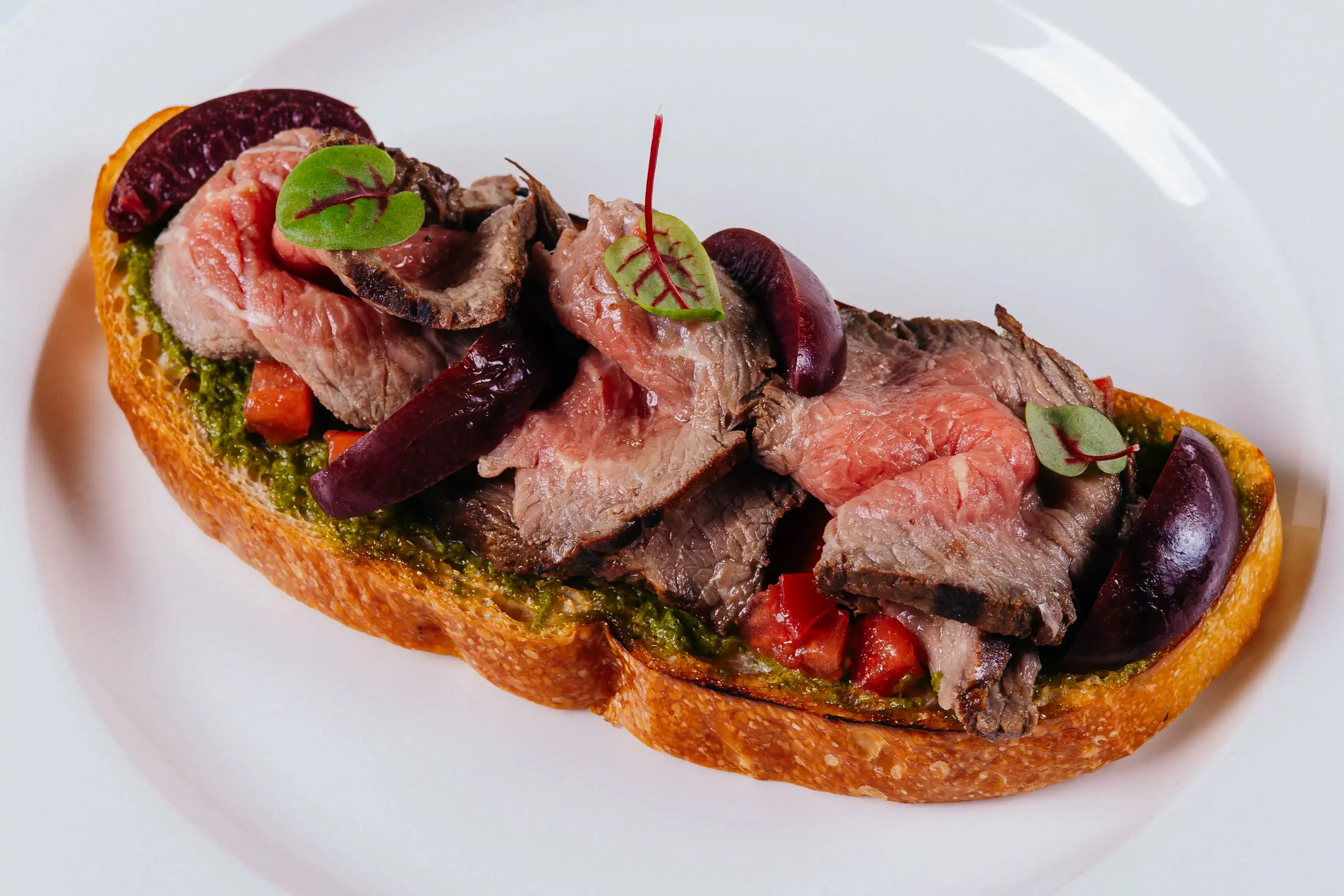 Pin-Up с лососем слабой соли с мягким сыром. Брускетты с маринованным ростбифом, сливой и соусо...{{weight}}/{{formatPrice((price + extrasPrice) * count)}}₸